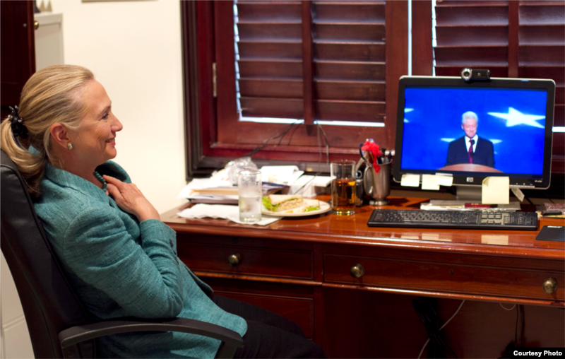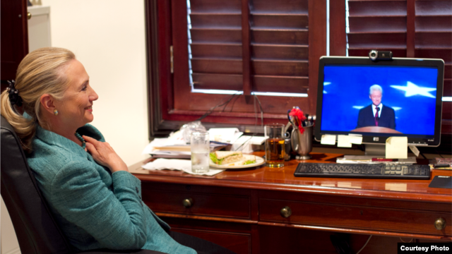 Trong lúc cựu Tổng thống Bill Clinton đọc bài diễn văn hùng hồn tại Đại hội Toàn quốc của đảng Dân chủ, phu nhân của ông là bà Hillary Clinton đang ở một nơi cách đó 16.000 kilomét để chu toàn nhiệm vụ của một vị ngoại trưởng Mỹ.