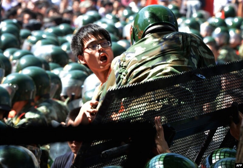 Người biểu tình Trung Quốc cố gắng trèo qua hàng rào cảnh sát bên ngoài Đại sứ quán Nhật Bản ở Bắc Kinh