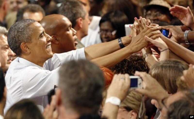 Những người ủng hộ vây quanh Tổng thống Obama sau buổi nói chuyện của ông tại Trung tâm Hội nghị Palm Beach, ở West Palm Beach, Florida hôm Chủ nhật 9/9/12